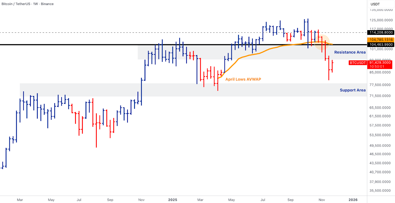 Weekly candle closed above the stress-floor band; April-lows AVWAP (~$100–106k) still defines medium-term resistance.