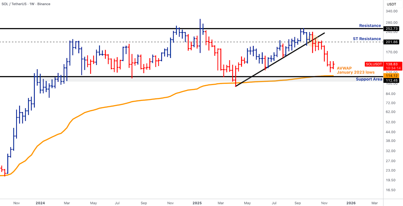 Despite ETF strength, SOL price drifted toward the Jan-2023 AVWAP (~112), reflecting leveraged unwinds and chart-level vulnerability.