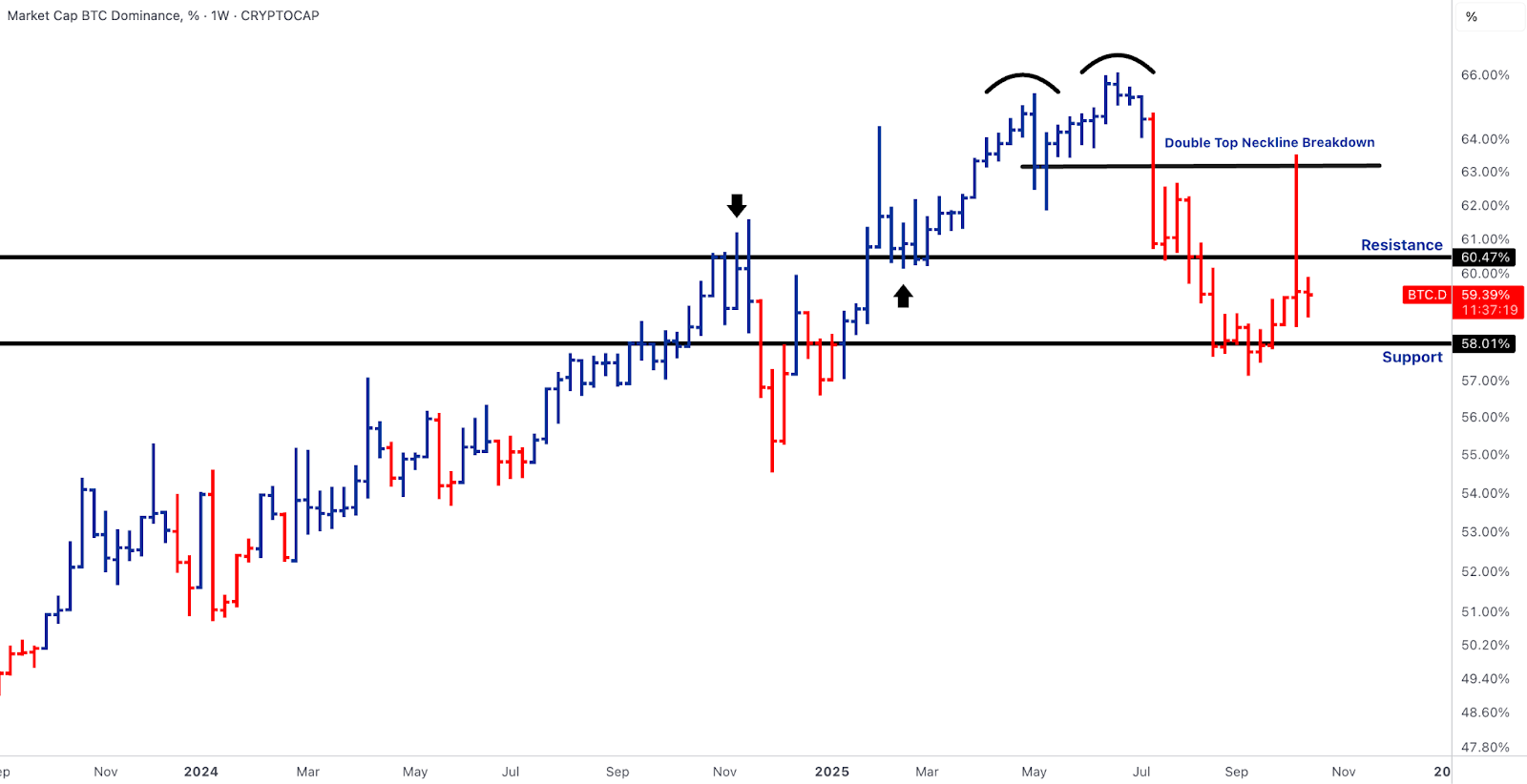 Structural Bias Maintained Despite Drawdown: Despite the outflows, the TOTAL3 index (chart below) defended the $1 trillion base, and BTC Dominance remained capped below 60.5%, reinforcing that the altcoin rotation bias persists even amid drawdowns.