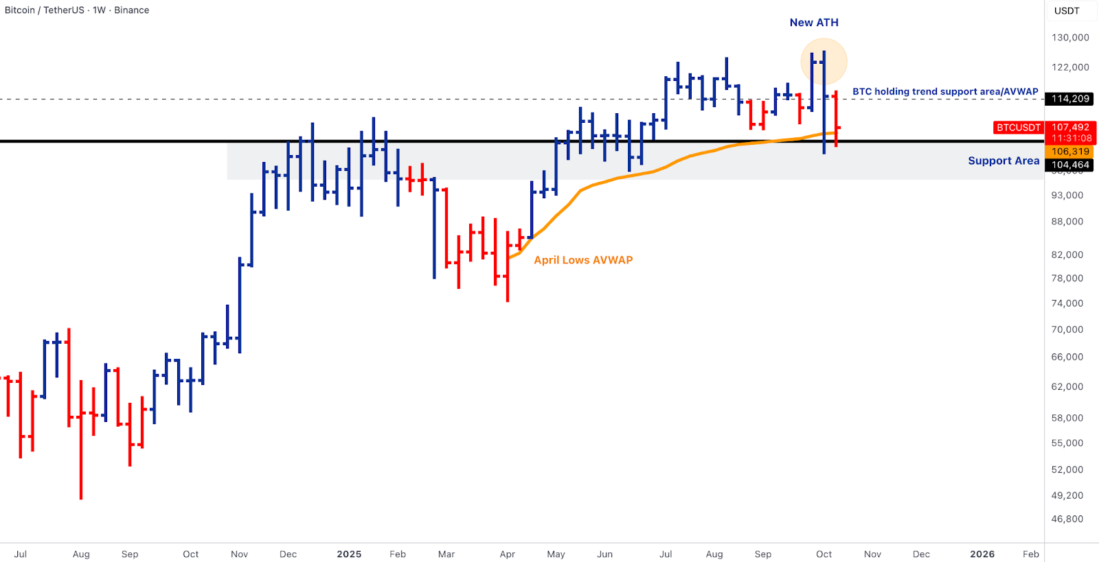 BTC’s retracement to ~$107-109K found clear demand near the April lows anchored VWAP (~$106k), preserving the mid-cycle structure (chart below).
