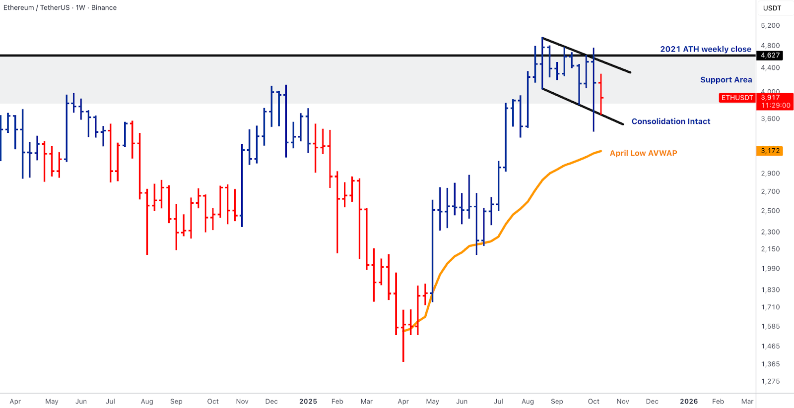 Technically, ETH continues to consolidate between $3,600-4,630. The April-low VWAP near $3,170 defines deep structural support; a reclaim of $4,627, the 2021 ATH weekly-close band, would confirm leadership rotation back from BTC. For now, relative stability amid outflows signals robust on-chain demand absorption.