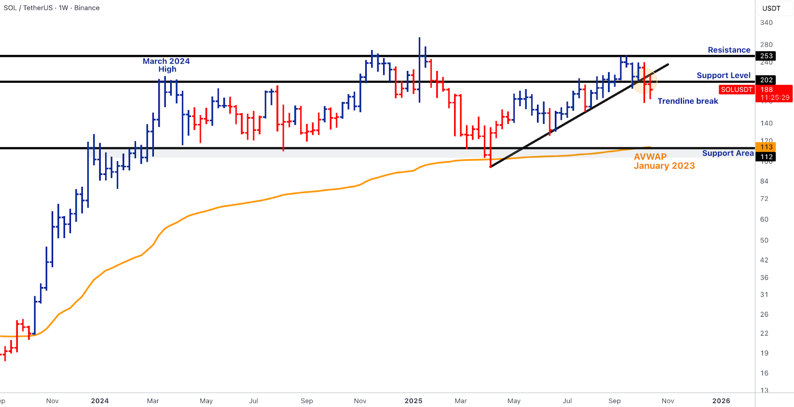 SOL remained the key beta gauge. After last week’s ~23% intraday drawdown, SOL recovered to ~$188, still below its $200-210 inflexion band (chart below).