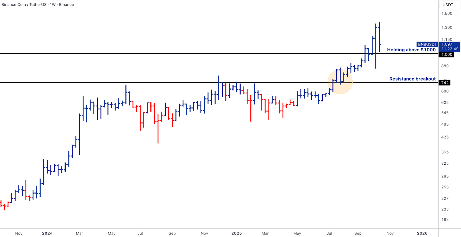 Together, SOL and BNB remain breadth thermometers: their stability indicates that internal market structure is rebuilding, not breaking.