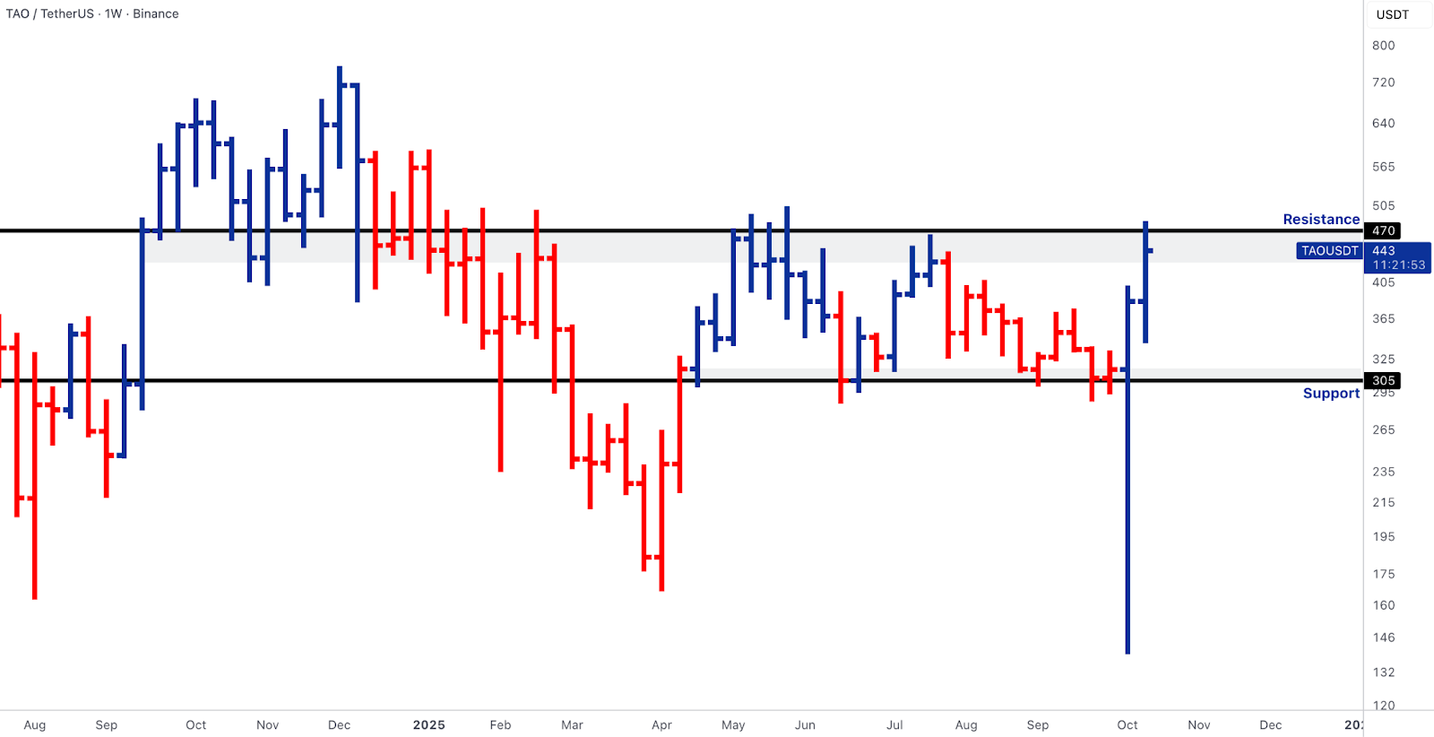 TAO (Bittensor) surged after its treasury announced $11M in cross-network synergies and new subnet deployments. The weekly chart (below) shows a breakout through $400-470 resistance, confirming structural leadership.