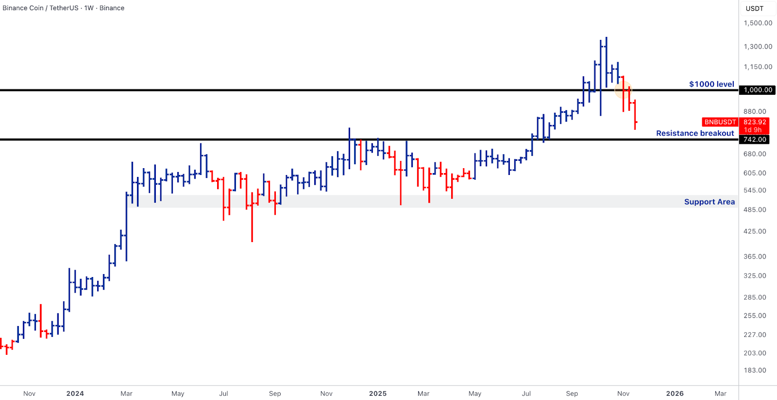 Price retraced from $1,000 but remains above $742 breakout. Behaves more like a cash-flowing exchange equity than a speculative L1 token amid deleveraging.