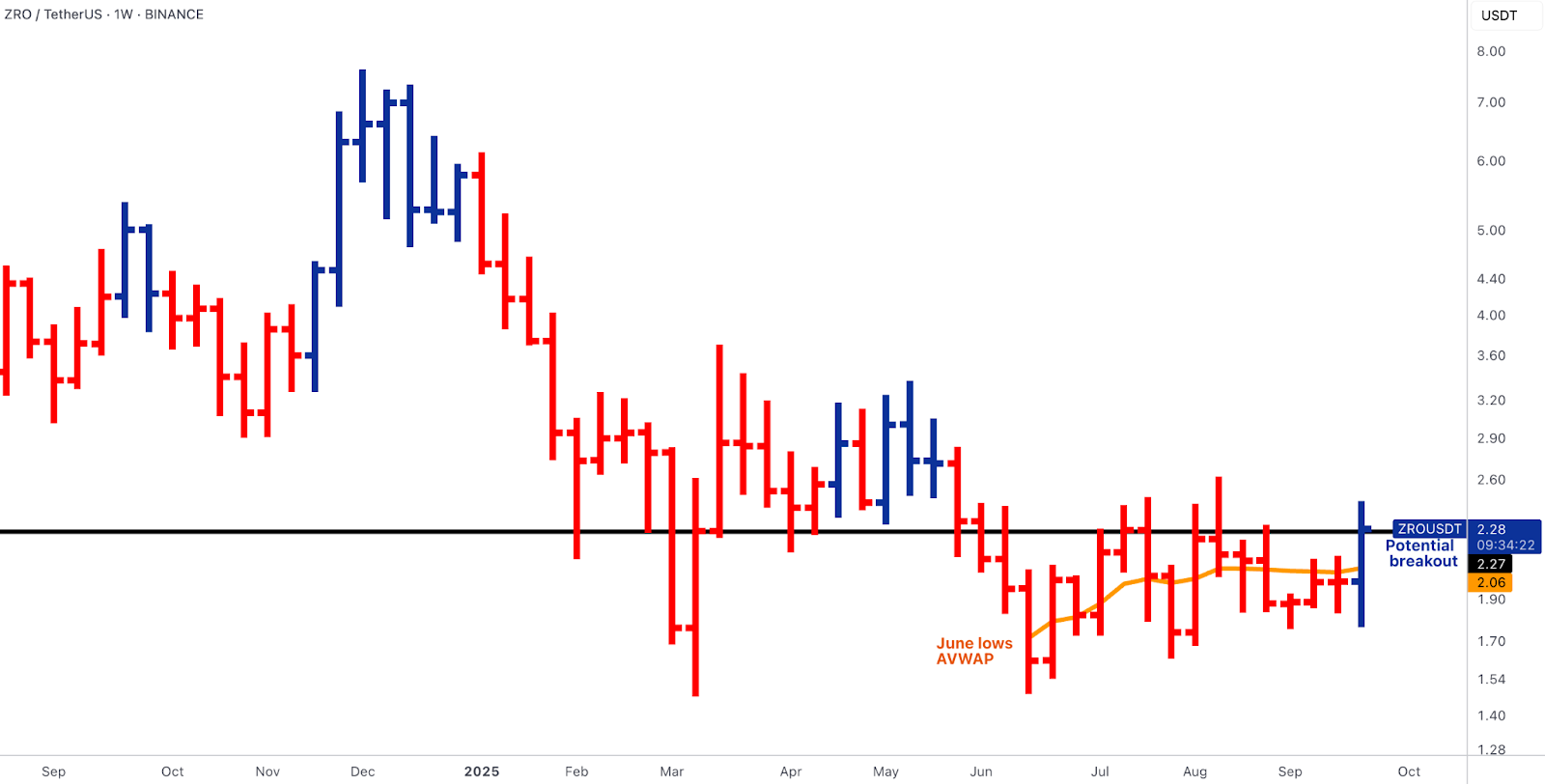 LayerZero absorbed its Sep 20 unlock (~25.7M, 8.5% supply) better than expected, with the STG merge consolidating bridging liquidity. Price pushed into a potential breakout above $2.25 (chart below). Reclaiming the June-low AVWAP also marks potential for outperformance here.