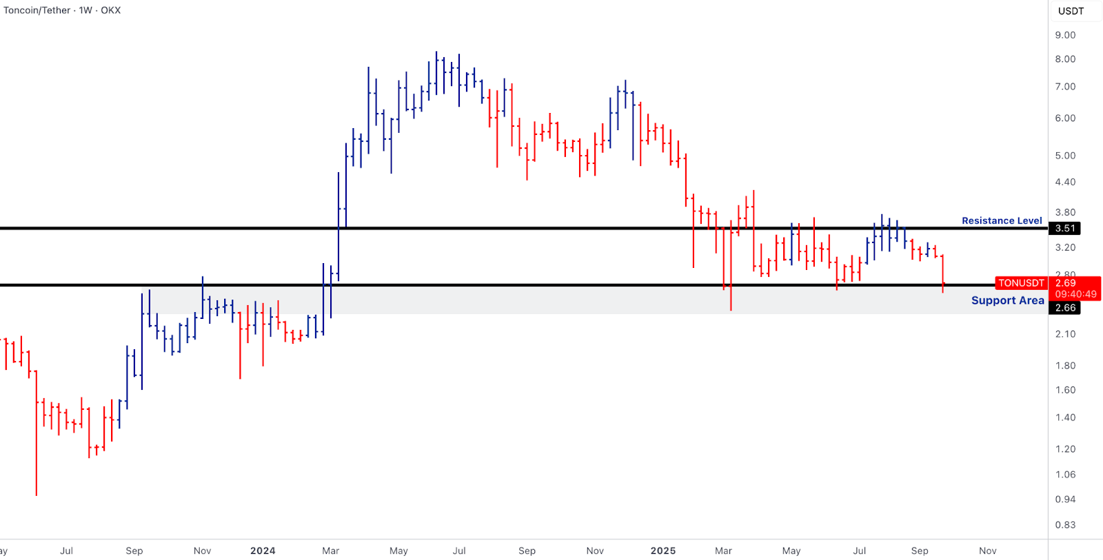 A Nasdaq-listed firm’s $30M TON purchase gave TON institutional sponsorship, but the price broke below $2.70 support (chart below). Unless it reclaims $3.00, the catalyst risks being dismissed as episodic. TON sits in the balance between strong narrative pull and weak chart structure.