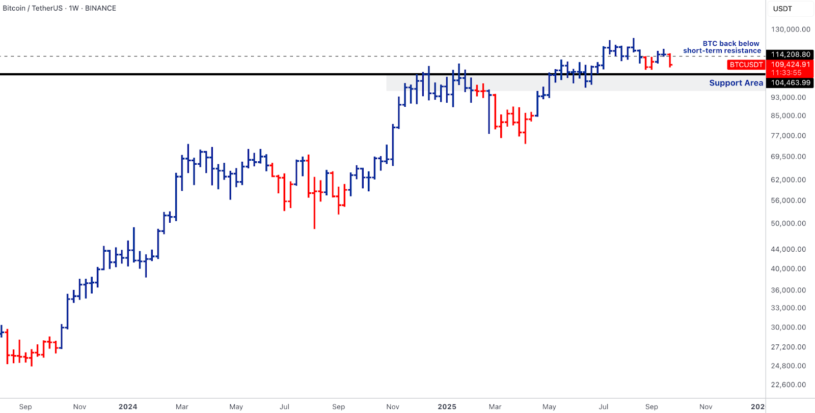 BTC’s structure deteriorated after failing to sustain above the 114-116k band, slipping back toward the ~109k handle (chart below).