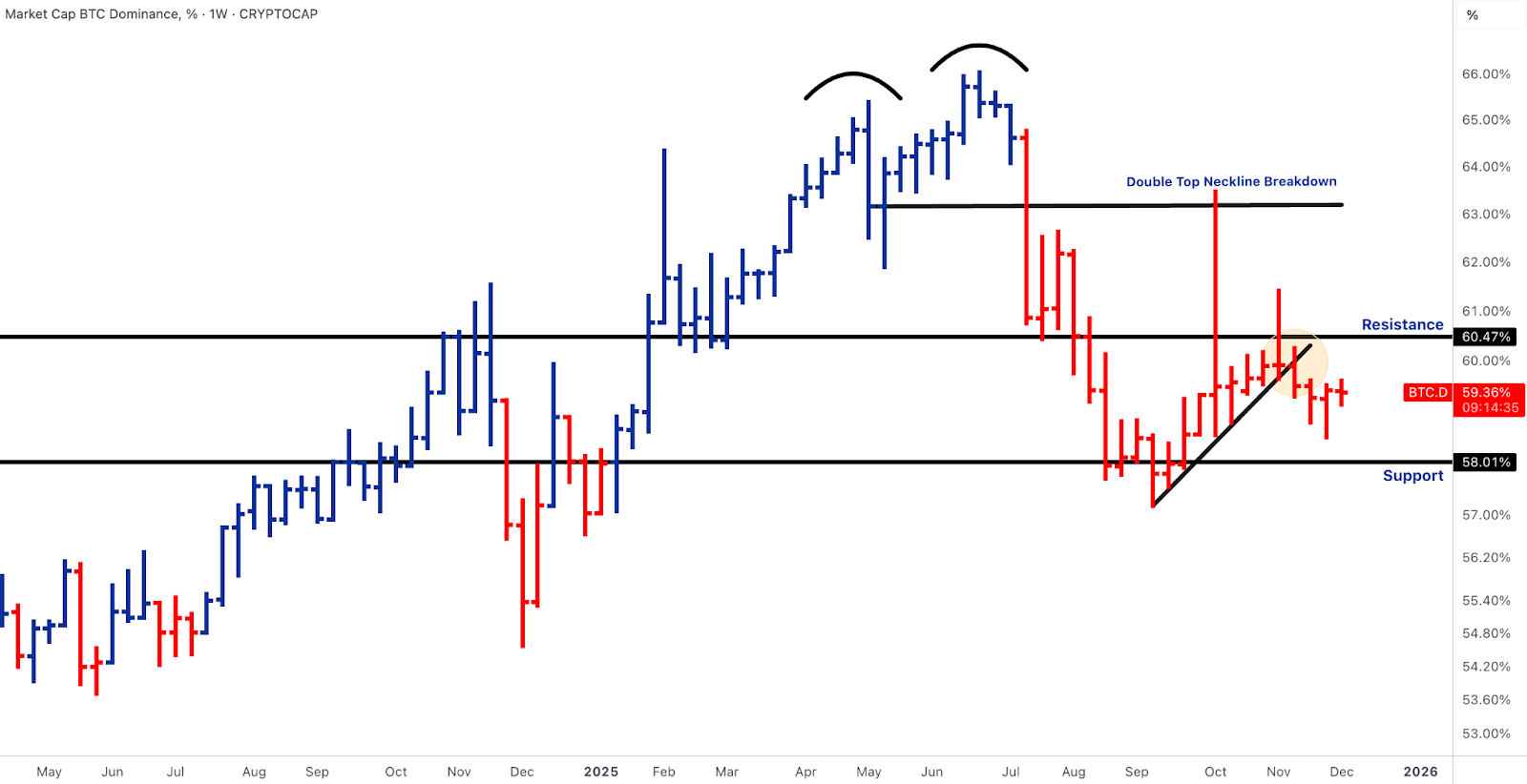 With TOTAL3 failing its trendline and BTC.D stuck in containment, this week’s outperformance was concentrated in catalyst-driven names.